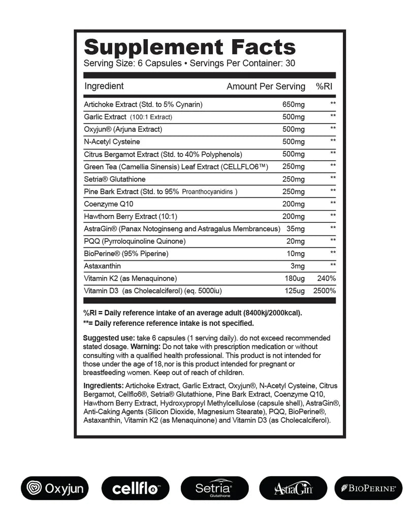 250mg CELLFLO6® (Camellia sinensis): This patented green tea extract is one of the best circulatory health ingredients on the market, purported to lower blood pressure, bad cholesterol. Cellflo6 can promote brain function benefits along with boosted immune system due to high antioxidant content which also helps reduce inflammation. this ingredient can also support blood sugar levels.