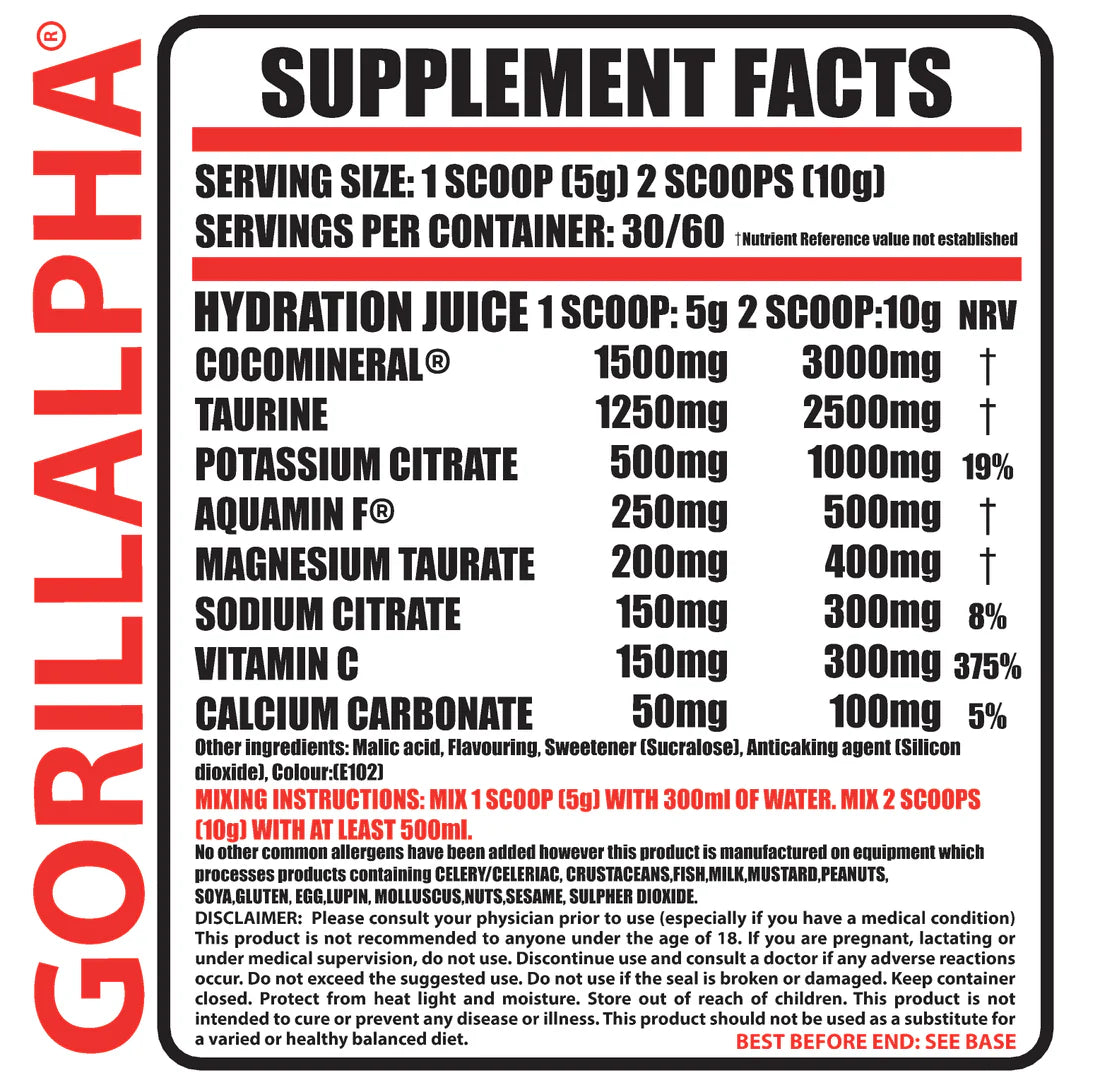 - Optimal Recovery: Hydration Juice supports faster recovery by replenishing the minerals and electrolytes lost through sweat, helping to reduce cramps, muscle fatigue, and dehydration. The inclusion of Vitamin C also aids in reducing inflammation and speeding up recovery time.