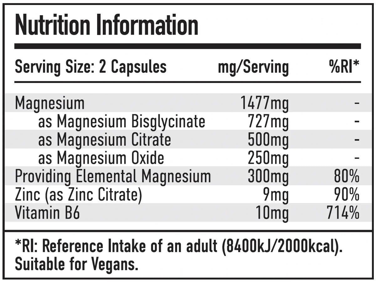 INGREDIENTS: Magnesium Bisglycinate, Magnesium Citrate, Magnesium Oxide, Zinc Citrate, Vitamin B6 (Pyridoxine HCL), Magnesium Stearate, Hydroxypropyl Methylcellulose Capsule.